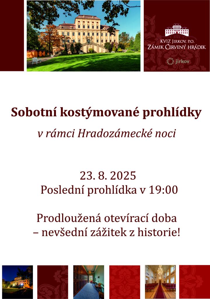 Při příležitosti celorepublikové Hradozámecké noci bude v sobotu 23. srpna prodloužena otevírací doba našeho prohlídkového okruhu. Nenechte si ujít speciální kostýmované prohlídky, které vás zavedou do historie!
