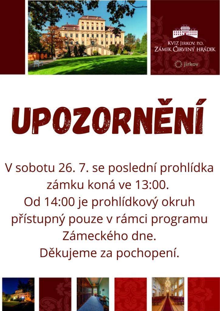 V sobotu 26. 7. se poslední prohlídka zámku koná ve 13:00. Od 14:00 je prohlídkový okruh přístupný pouze v rámci programu Zámeckého dne. Děkujeme za pochopení!