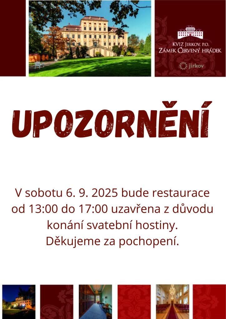 V sobotu 6. 9. 2025 bude zámecká restaurace od 13:00 do 17:00 uzavřena z důvodu konání svatební hostiny. Děkujeme za pochopení.