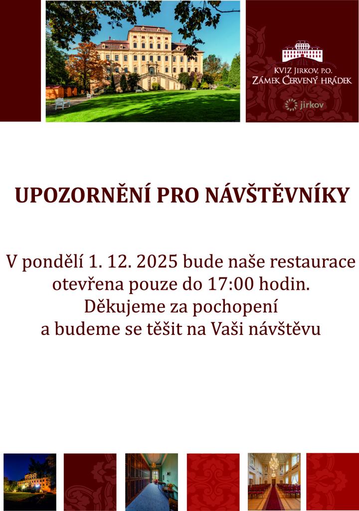 V pondělí 1. 12. 2025 bude naše restaurace otevřena pouze do 17:00. Děkujeme za pochopení a budeme se těšit na Vaši návštěvu!