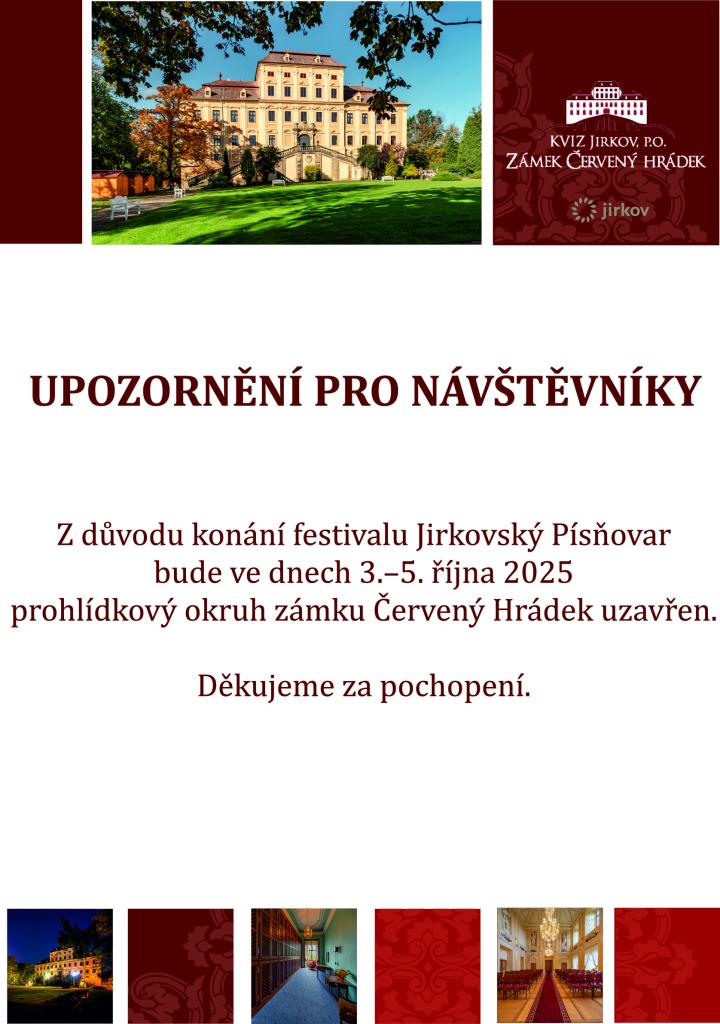 Z důvodu konání festivalu Jirkovský Písňovar bude ve dnech 3.–5. října 2025 prohlídkový okruh zámku Červený Hrádek uzavřen. Děkujeme za pochopení.