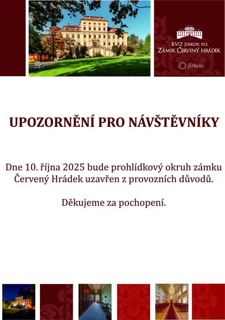 Dne 10. října 2025 bude prohlídkový okruh zámku Červený Hrádek uzavřen z provozních důvodů. Děkujeme za pochopení.