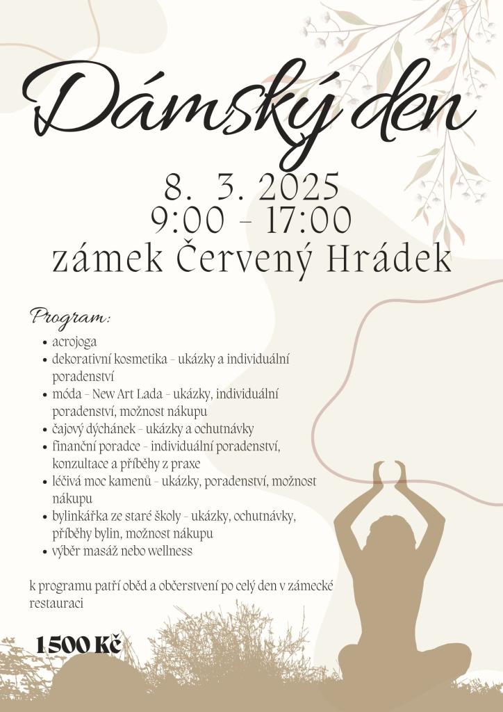 Připraveno je malé cvičení, o krásu se postará kosmetička Iveta Brůnová a o eleganci Lada Hellerová (New Art Lada). Sílu přírody přiblíží čajový dýchánek Martina Vaňka, bylinkářka Hana Zvalová a manželé Tothovi – Kameny od jednorožce. A starosti s hospodařením pomůže vyřešit úspěšný finanční poradce Jan Uhlík. V průběhu dne budou připraveny individuální masáže a v malinkých skupinkách wellness. Oběd a občerstvení během dne zajišťuje Zámecká restaurace.